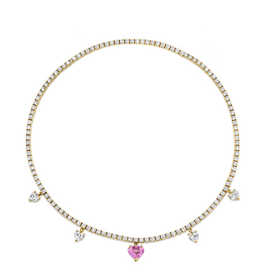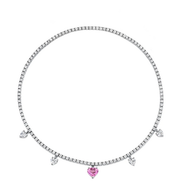 Pink Sapphire and Diamond Dangling Heart Tennis Necklace
