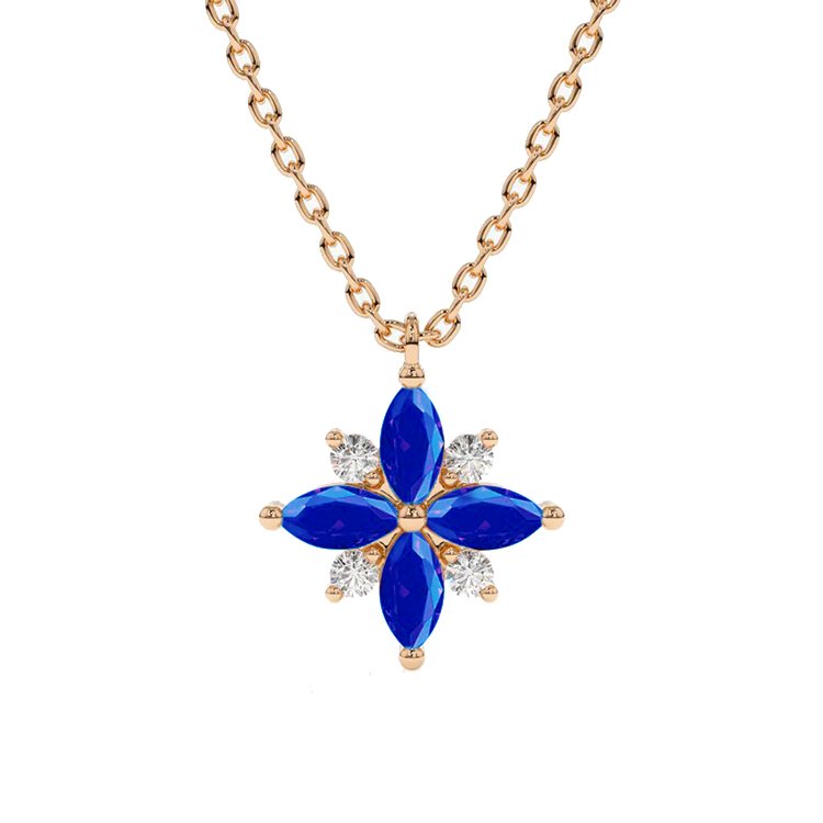 Unleash your inner beauty with our Blue Sapphire and Diamond Lotus Pendant. Featuring 4 marquise cut blue sapphires and 4 round cut diamonds, this pendant resembles a lotus and exudes elegance.