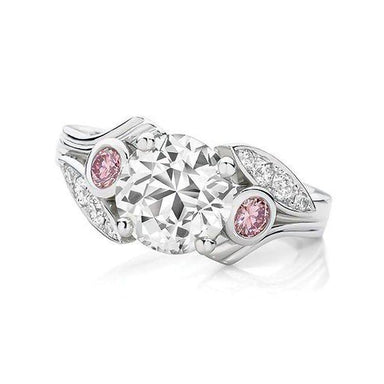 Details 2.00ct round brilliant cut white diamond in a four-prong setting. Two fancy intense Argyle Pink Diamonds and pavé diamond leaf detailing...
