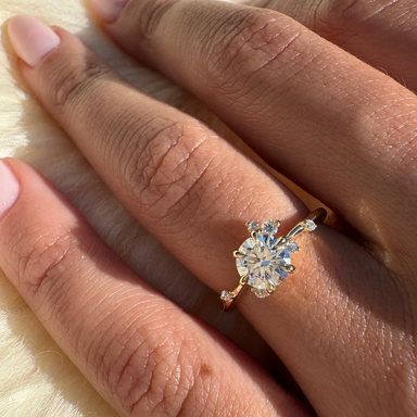 View full detailsDetails Oval cut lab grown diamond in a four-prong setting. 2x pear cut lab diamond side stones. Metals Available in 18ct Rose Gold, White Go...