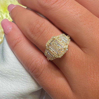 Details The Golden Mirrors Lab Grown Engagement Ring features a stunning three-stone design with emerald cut lab grown diamonds, each securely he...