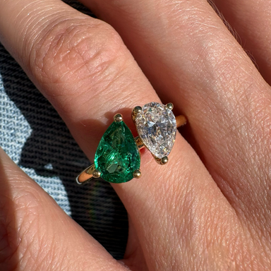 View full detailsDetails This Lab Grown Diamond Pear and Emerald Twin Ring is an exquisite two-stone engagement ring. Featuring a pear cut lab grown diamond in a t...