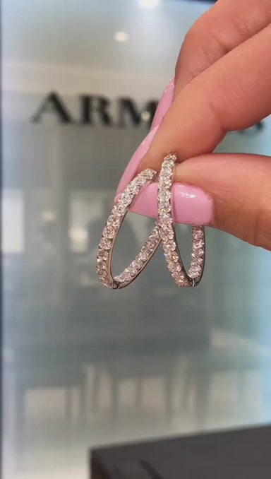 View full detailsDetails Diamond hoop earrings, set in pavé with melee white diamonds. Total Carat Weight: 2.12ct Snap closure for pierced ears. Metal Availabl...