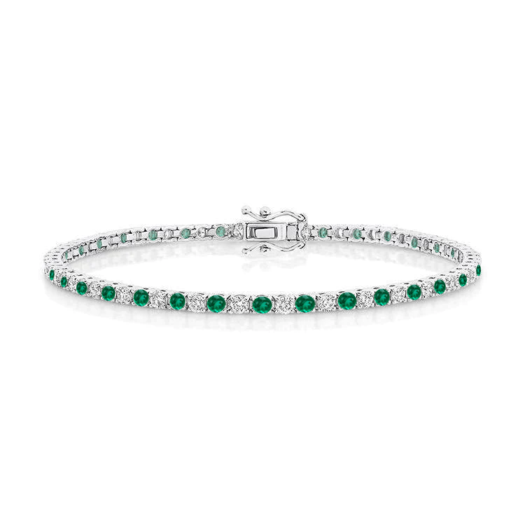 - Tennis bracelet handmade with alternating round cut diamonds and green emerald stones, each set in four-claw prongs.