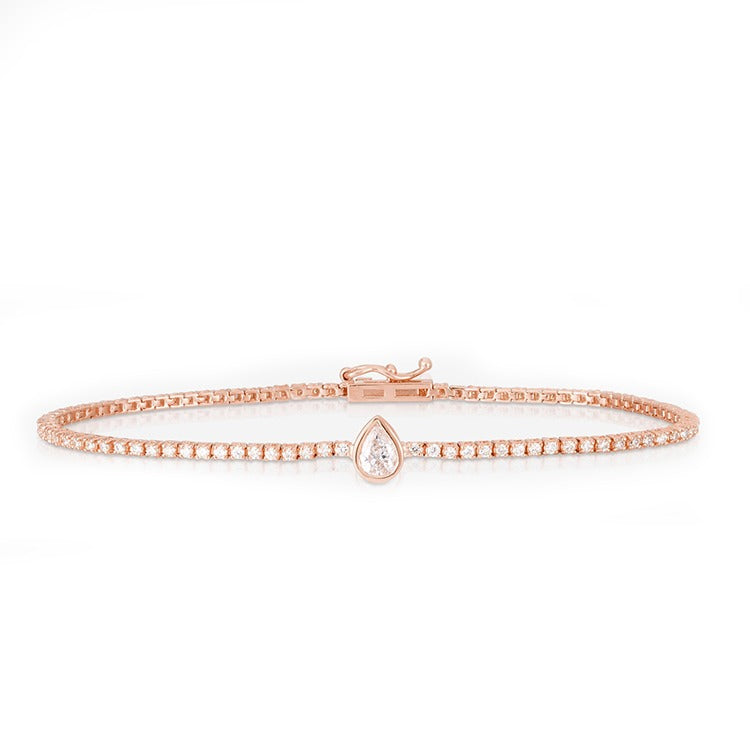 • Diamond tennis bracelet with a bezel set pear centre diamond