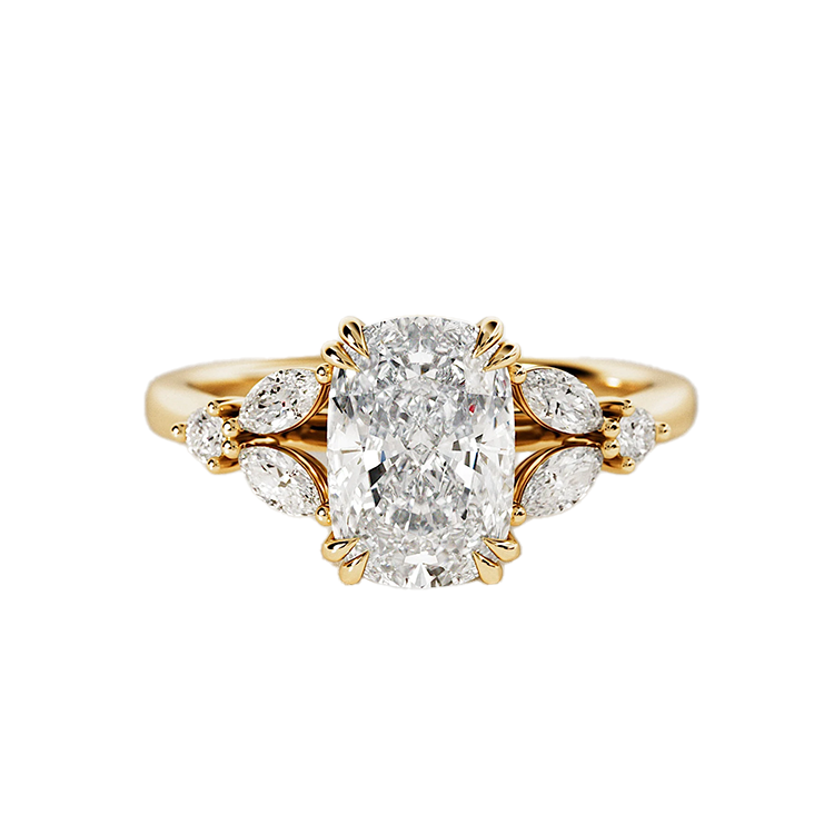 The Celestial Cushion Cut Lab Grown Diamond Engagement Ring showcases a beautiful cushion cut lab grown diamond at its centre, set in a solid gold band with a secure double 4 prong setting. Flanked by a set of three marquise and round cut lab grown diamonds on each side, this ring is meticulously crafted to blend classic elegance with modern design. It's the perfect symbol of your enduring love and commitment, making it an ideal choice for a truly unforgettable engagement!