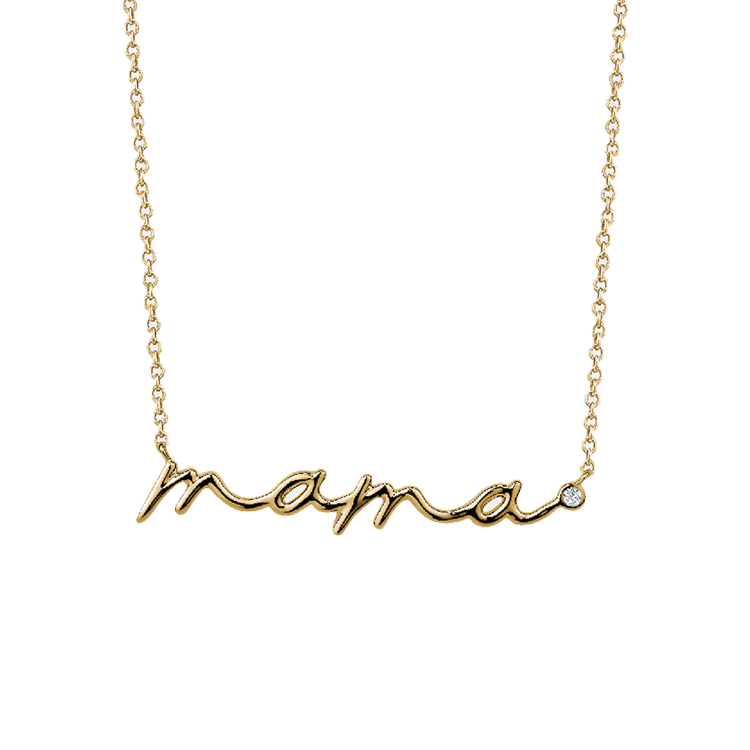This Cursive Solid Gold Mama Necklace is the perfect way to celebrate motherhood. The word "mama" is delicately crafted in a solid gold cursive font, adding a touch of elegance. The bezel-set round cut diamond at the end of the word adds a subtle sparkle, making this necklace a beautiful and meaningful accessory for any mum.