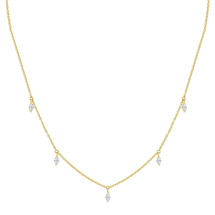 Make her heart dance with this romantic necklace adorned with a string of 5 dangling marquise cut diamond drops. An elegant addition to any look, this necklace is sure to inspire emotion and admiration.