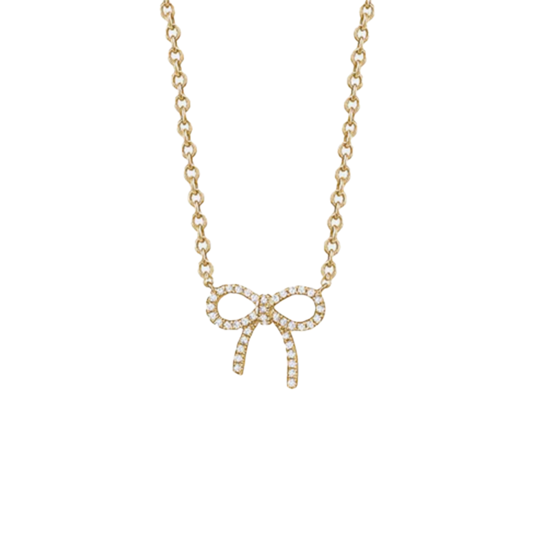 Unleash your sparkle with our Diamond Bow Necklace. This uniquely designed necklace features a charming bow adorned with pavé diamonds, adding a touch of elegance and playfulness to any outfit. Perfect for any occasion, it's sure to catch the eye and light up your look.