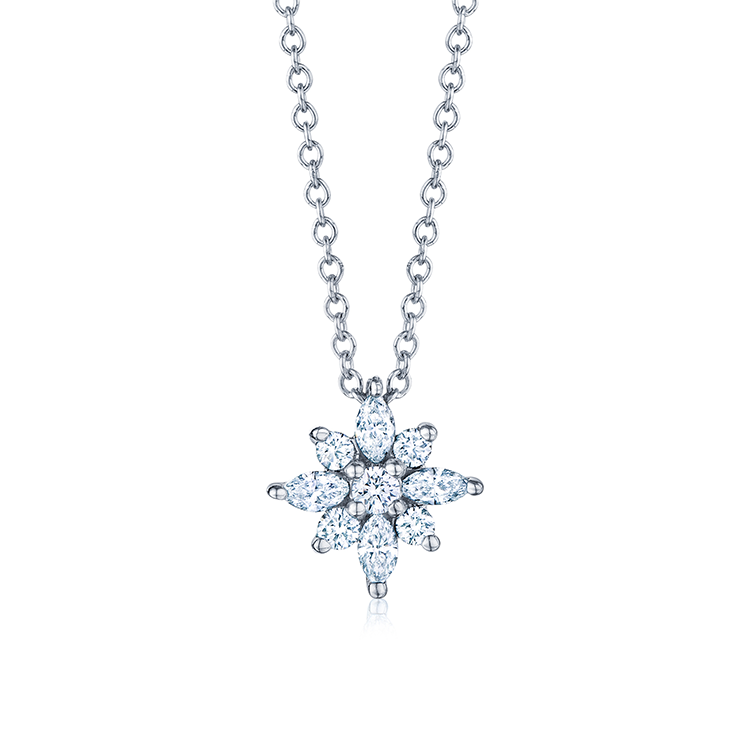 Make a stunning addition to your jewellery collection with this beautiful diamond star Necklace. Intricately hand crafted with 8 radiating pear cut diamonds and a single sparkling round diamond in the centre, this piece will illuminate your outfits with luxurious sparkle.