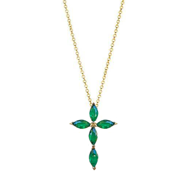 Elevate your faith and style with our Green Emerald Marquise Cross Necklace! Uniquely designed, this necklace features five stunning 5x marquise cut green emerald stones, adding a touch of elegance and individuality to your look.