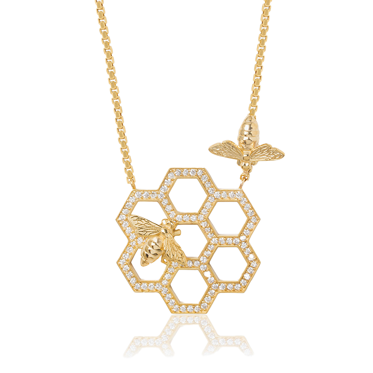 Elevate your style with the Honeycomb Bee Necklace. This captivating piece features a honeycomb design, intricately outlined with small white diamonds that catch the light beautifully. Two solid gold bees gracefully adorn the honeycomb, adding a touch of refined elegance. The combination of sparkling diamonds and golden bees creates a unique, nature inspired accessory that enhances any outfit with sophistication.