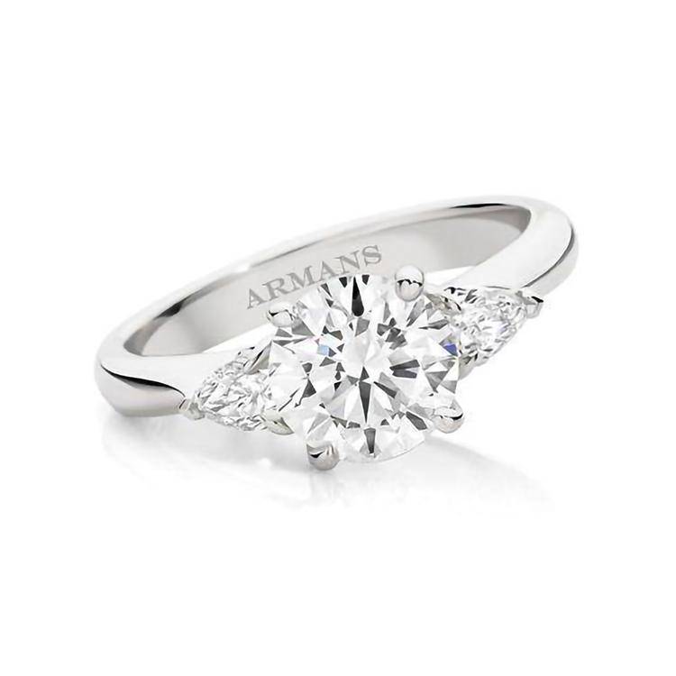 - Round brilliant cut diamond with two pear cut side stones totalling 0.24ct.