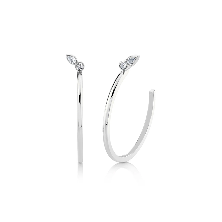 Dazzle with these Madeline Hoop Earrings! These open solid gold hoops feature a bezel set round and pear cut diamond on the stud, adding a touch of sparkle to your look. Perfect for any occasion, these earrings are a must-have for adding a playful charm to your style.