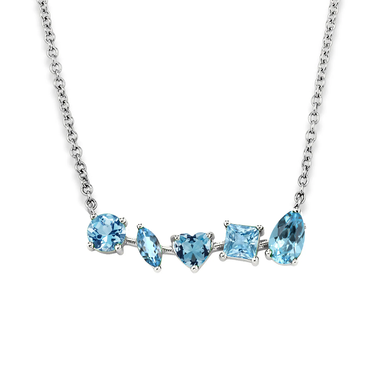 Dive into style with our Multi-Shaped Aquamarine Bar Necklace! Adorned with a blend of round, marquise, heart, princess, and pear shaped aquamarines, this necklace is a must-have for any fashion-forward individual. Perfect for adding a touch of playfulness to any outfit.