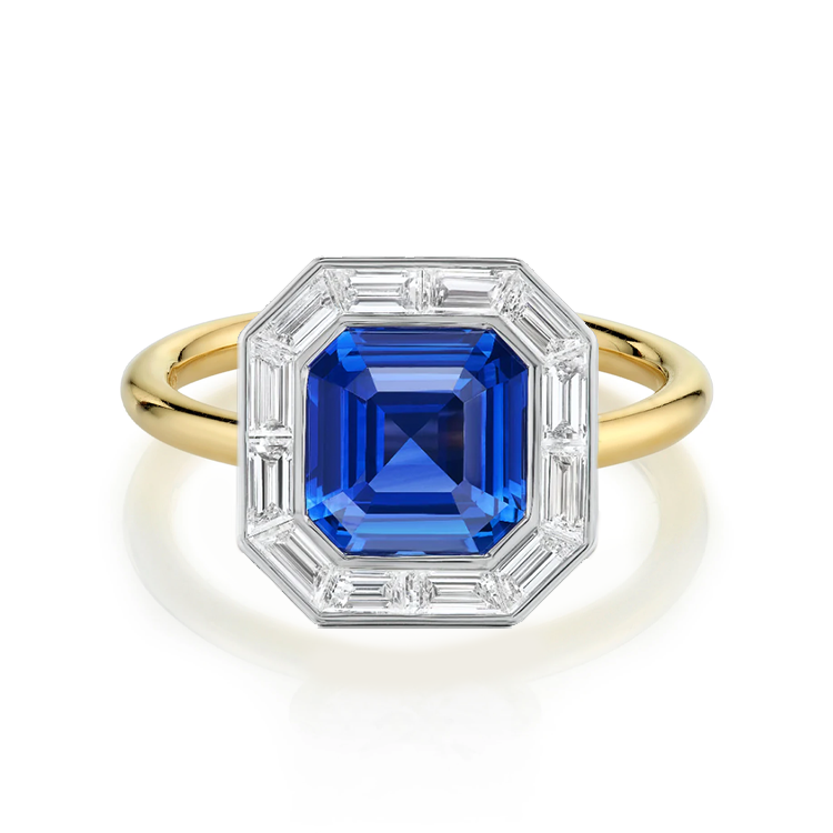The Royal Blue Lab Grown Sapphire Radiance Ring is a stunning fusion of elegance and allure. Its captivating asscher cut lab grown blue sapphire, encircled by a delicate halo of baguette cut lab grown diamonds, exudes timeless charm. Set on a solid gold uniform band, this ring is a symbol of enduring love and exquisite craftsmanship.